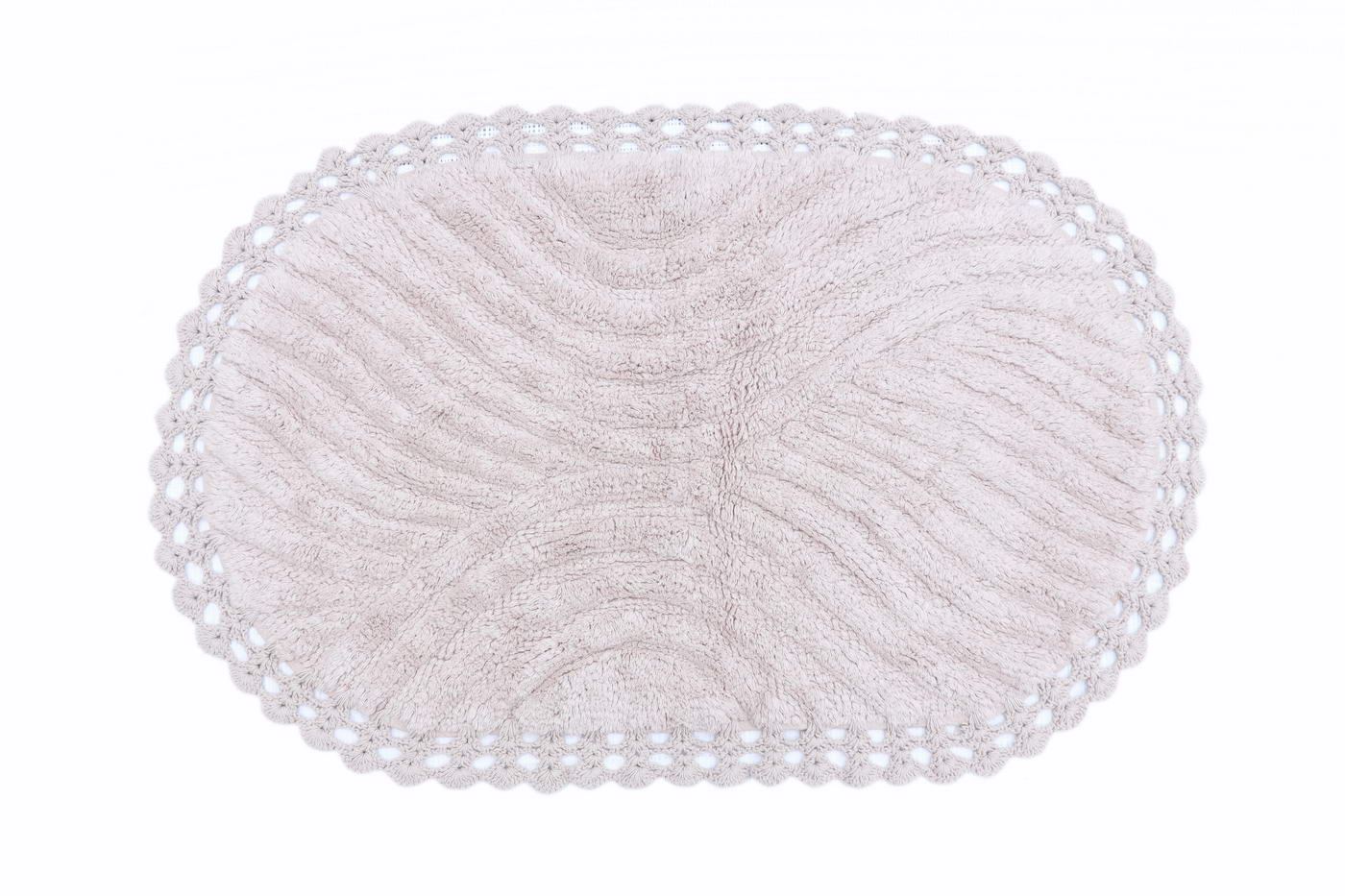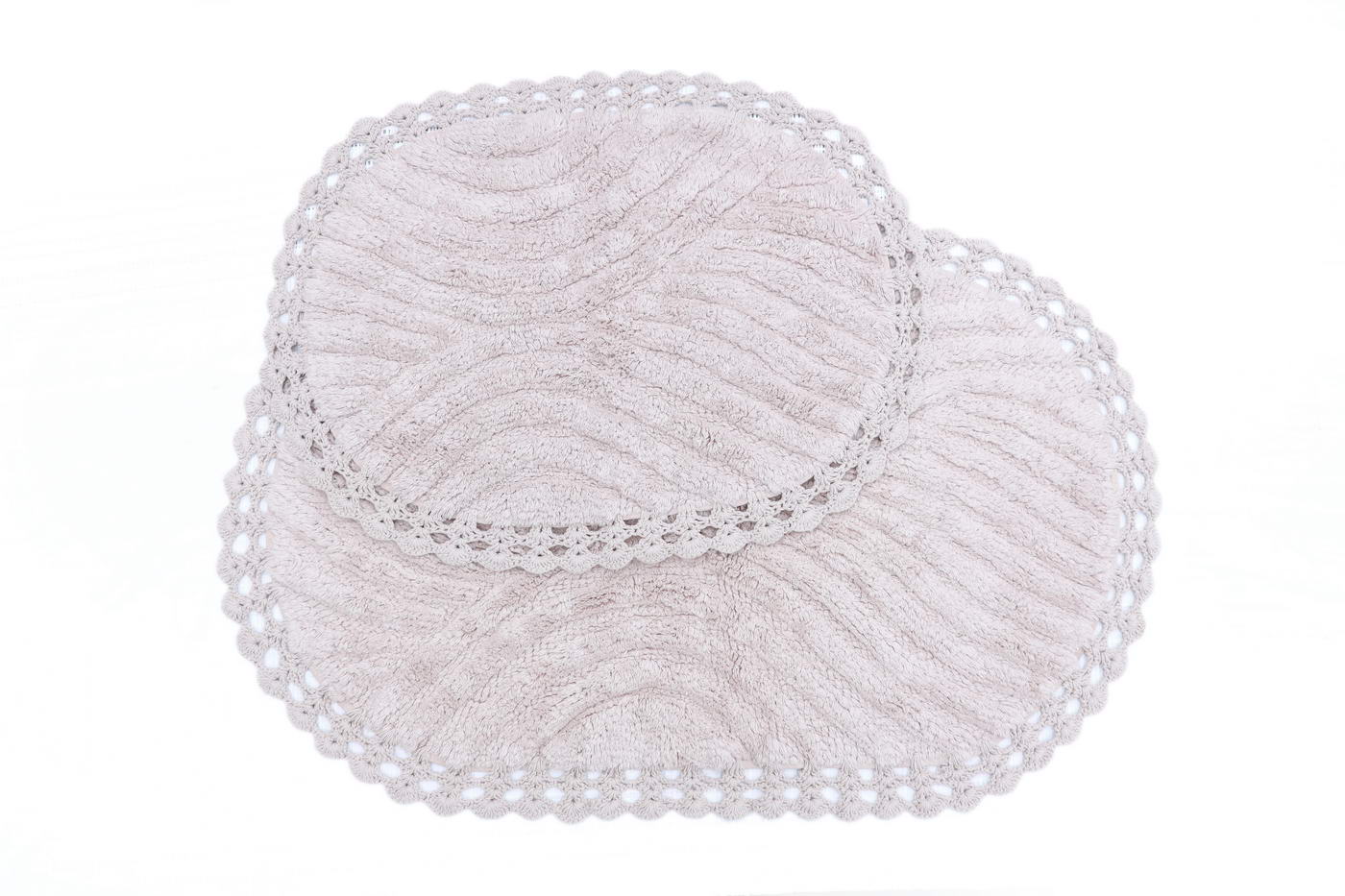 Материал: 100% хлопок, махра. Плотность, г/м2: 1800. Размеры, см: 60х100(1) и 50х70(1). Декор: кружево. Уход: стирка при 30°С. Изделие гипоаллергенно, без синтетических красителей, пропитки и обработки. Кружевные коврики для ванной комнаты из высококачественного 100% хлопка не только мгновенно впитывают влагу, они мягкие и приятные на ощупь, а цветовая палитра воссоздает природные оттенки. Коврики из натуральных материалов прекрасно подойдут для современных, классических, а также для интерьеров в стиле «прованс».