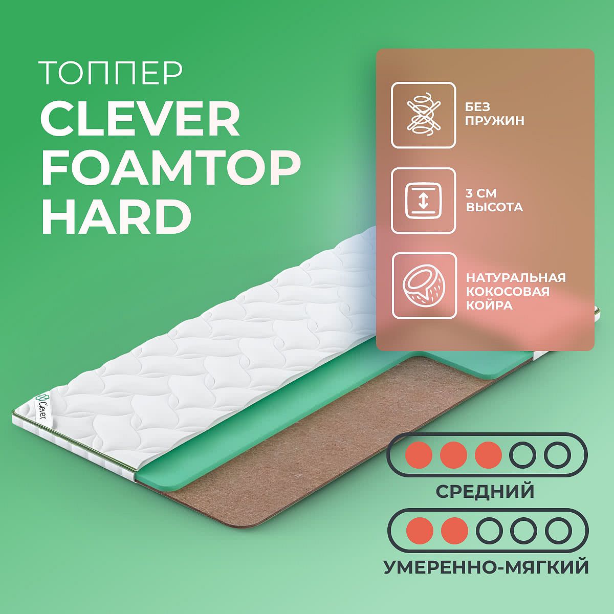 Матрас-топпер Clever FoamTop Hard относится к тонким моделям, так как его толщина всего 3 сантиметра. Жесткость изделия — средняя, что является универсальным вариантом для людей любого возраста. В составе матраса слой мягкого пенополиуретана и слой кокосовой койры, которые вместе и образуют среднюю жесткость. Чехол матраса — приятный на ощупь материал из жаккардовой ткани. Изделие доставляется в рулоне, поэтому матрас легко транспортировать и переносить с места на место в случае надобности и транспортировать в общественном транспорте. Для дачи — идеальный вариант. Матрас можно заказать с креплениями или без них. В качестве креплений могут выступать как резинки по углам, так и липучки с помощью которых спальное место надежно фиксируется к металлической раме дивана, тахты или кровати-раскладушки. Данную модель можно использовать и поверх старого матраса для изменения жесткости или для обновления спальной поверхности.