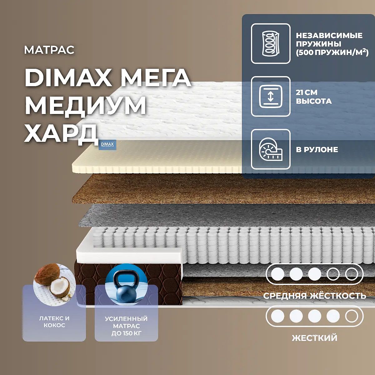 Уровень жесткости: средний/высокий. Жесткая поддержка кокосаМодель имеет две разножесткие поверхности, одна сторона дополнительно усилена слоем кокосовой койры. Это натуральный и гипоаллергенный материал. Его получают из околоплодника кокосовой пальмы, сухие волокна пропитывают соком латекса, чтобы они получили эластичность. Кокос - очень жесткий и прочный, он способен выдерживать большие нагрузки. Кокос создает надежную поддержку для позвоночника, позволяет телу находиться в естественном положении. А также кокос хорошо вентилируется и не имеет запаха.Сочетание кокоса и латексаС другой стороны проложены слои кокоса и натурального латекса. Это мягкий и очень упругий наполнитель, который создает благоприятный микроклимат на поверхности. Он прекрасно расслабляет и снимает напряжение. Кокос в сочетании с латексом создает средне-жесткую универсальную поверхность.Действие пружин S1000Модель базируется на блоке независимых пружин S1000. В такой конструкции по 500 микропружин занимают 1 кв. метр. Пружины имеют одинаковое строение и форму . Они помещены в отдельные чехлы из прочного и износостойкого материала и воспринимают нагрузку точечно. Когда человек садится или ложиться на такую поверхность, то прогибаются только те пружины, которые получают давление.Чехол из трикотажаЧехол матраса выполнен из качественного трикотажа и обеспечивает комфортный сон. Пласть изготовлена из мягкого материала, который приятен на ощупь. Вдобавок, чехол имеет декоративную простежку на двойном слое наполнителей (ППУ и Холлкон), которая создает рельефную поверхность, усиливает комфорт и добавляет привлекательности в дизайн матраса.Боковая часть выполнена из мебельной ткани коричневого цвета, которая обладает повышенной износостойкостью и придает матрасу стильный вид. Бурлет получил простёжку по ППУ. Высота модели составляет 21 см, рекомендованная нагрузка – 150 кг на спальное место. Защита матрасаДля защиты поверхности от пятен от пролитых жидкостей, грязи и пыли рекомендуем купить дополнительно защитный чехол или водонепроницаемый наматрасник.Другие моделиПосмотрите аналогичные мягкие модели: Dimax Мега Медиум Софт, Dimax Мега Софт.Скрутка в рулонПо умолчанию матрас поставляется в развернутом виде. По вашему желанию матрас может быть доставлен в скрученном виде.При доставке транспортной компанией матрас всегда скручивается в рулон. Хранение матрасов в скрутке должно осуществляться: