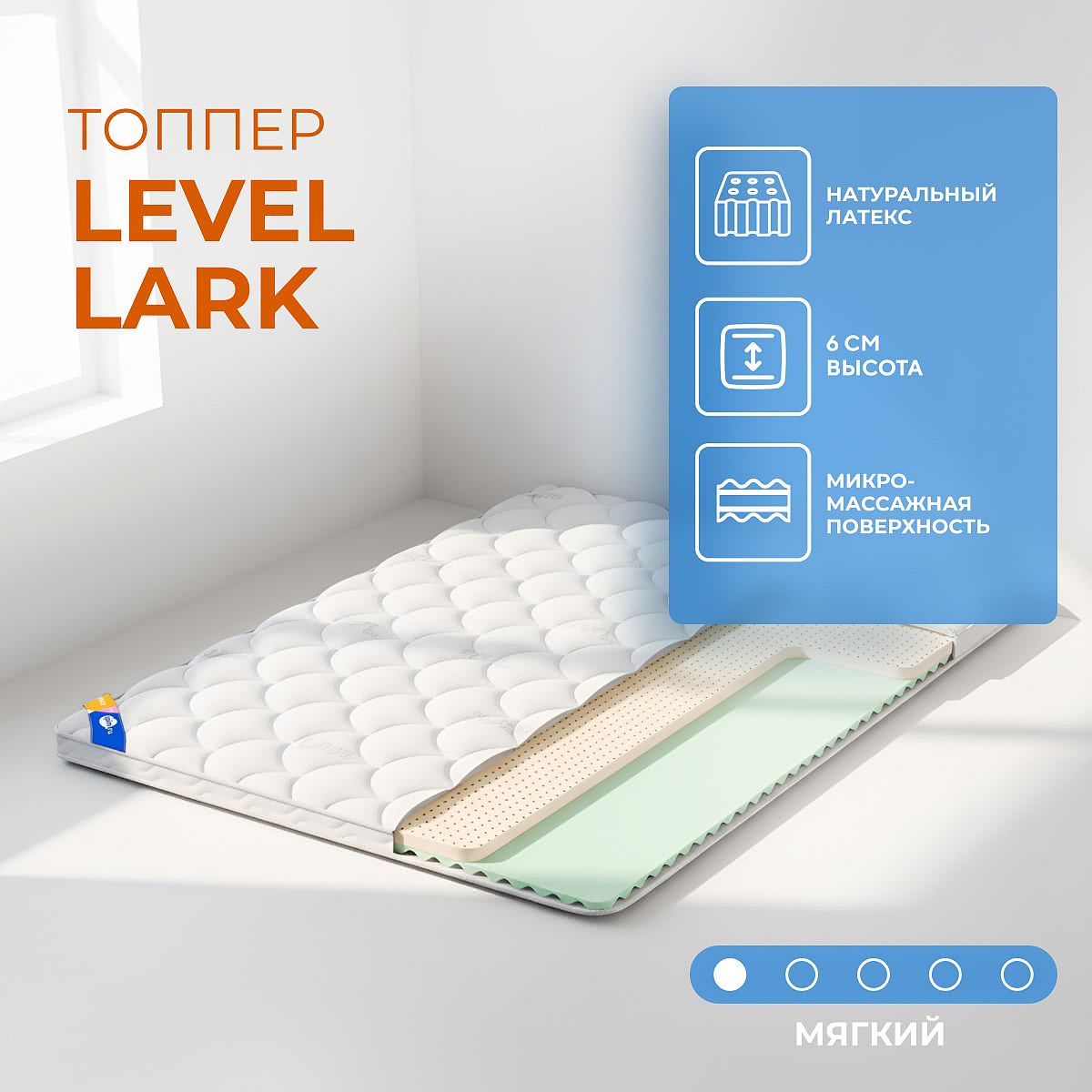 Тип крепления: резинки по углам. Высота: 6 см. Мягкий топперЕсли ваш матрас или диван слишком жёсткие, добавление невысокого мягкого топпера может сделать спальное место более комфортным и подходящим под ваши предпочтения.Мягкий невысокий матрас подстроится под форму тела, снизит давление на плечи, бёдра и другие части тела. Разный состав сторонС одной стороны топпера слой из натурального латекса, с другой – пена с массажным эффектом.Натуральный латекс – это материал, который получают из сока тропического дерева гевеи. Он обладает рядом преимуществ, среди них долговечность и воздухопроницаемость, что обеспечивает долгий срок службы и оптимальный микроклимат спального места. Сторона с латексом упруго-мягкая. Пена с массажным эффектом имеет рельефную текстуру. Она обеспечивает мягкий массаж во время сна, что способствует расслаблению мышц и улучшению кровообращения. Трикотажный чехолЧехол из мягкой трикотажной ткани гладкий и приятный на ощупь, что обеспечивает дополнительный уровень комфорта во время сна. Ткань обладает хорошей прочностью и долговечностью, она устойчива к истиранию, что гарантирует сохранение первоначального вида ткани на долгие годы.Крепление – резинки по угламРезинки по углам помогают надёжно закрепить топпер на матрасе, предотвращая его смещение во время сна. Благодаря такому виду крепления топпер плотно прилегает к матрасу, что помогает избежать его залома или скручивания.Они легко устанавливаются и снимаются, что упрощает процесс ухода за топпером и матрасом. Это также позволяет быстро менять постельное бельё. Крепление с помощью резинок подходит для матрасов разных размеров и высоты, что делает топпер универсальным решением для улучшения комфорта спального места.