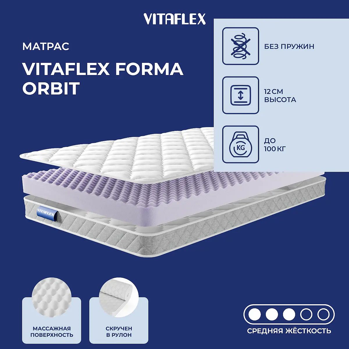 Матрас Vitaflex Forma Orbit — это беспружинный матрас средней жёсткости для комфортного сна в домашних условиях. Основной слой выполнен из RelaxFoam высотой 12 см с выраженной массажной поверхностью, которая мягко поддерживает тело и способствует расслаблению мышц во время отдыха. Благодаря средней жёсткости матрас подходит большинству людей среднего телосложения. Чехол выполнен из приятного на ощупь трикота с мягкой стёжкой из синтепона (100 г), бурлет из трикота серого цвета придаёт аккуратный внешний вид. Матрас выдерживает нагрузку до 100 кг на спальное место и может быть скручен в рулон по запросу, что упрощает транспортировку и подъём. Характеристики